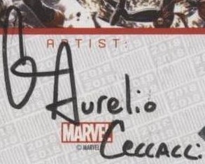 Wondering whose sketchcard you pulled from this perennial Marvel Annual set? Some artists are easy to tell, other artists' scribbles are not so obvious. Some have an artistic flourish of sorts on the front. When found, those are below as well. A couple of brief notes: